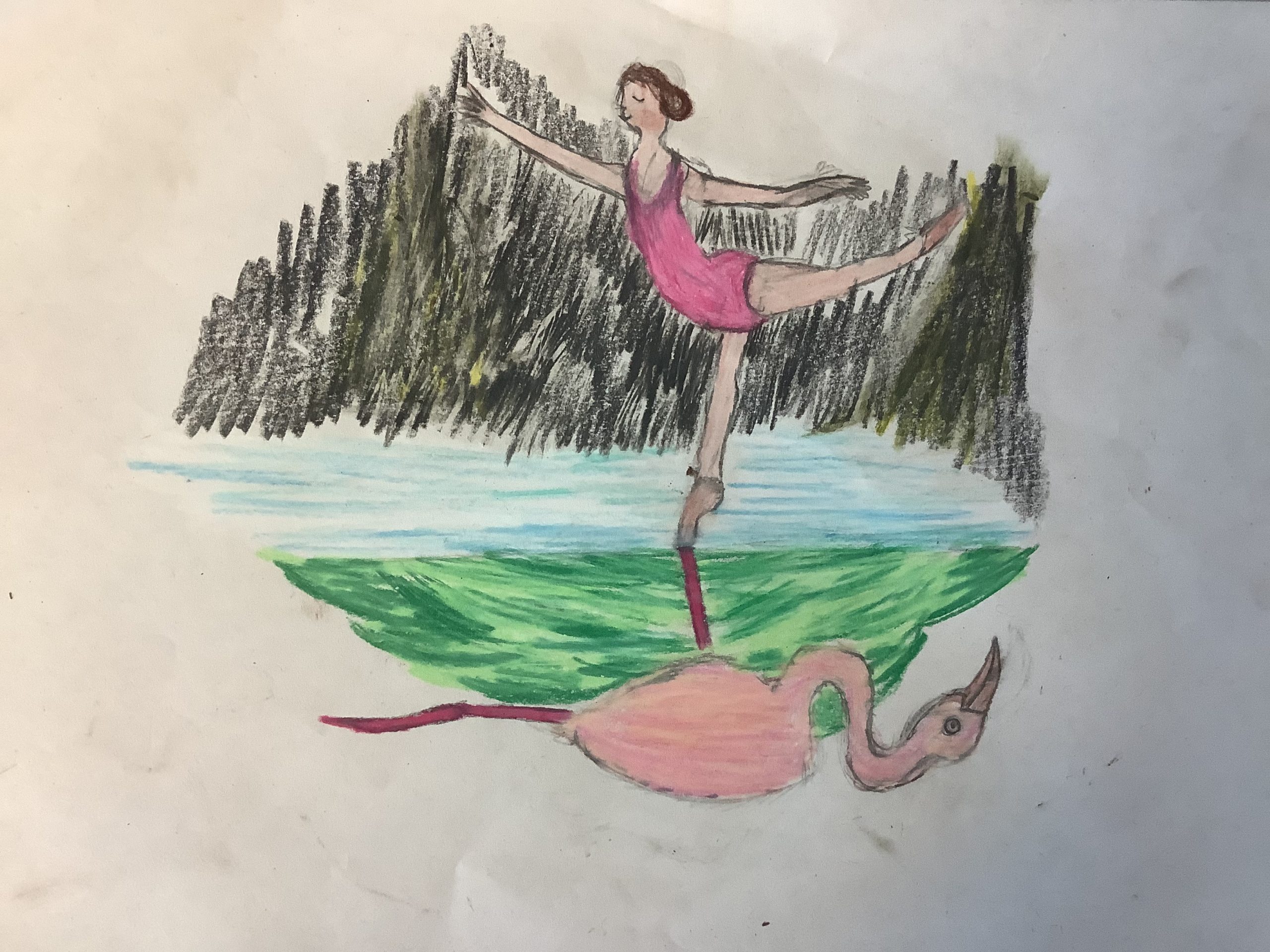 Imogen said: ” For the flamenco, I was inspired by a ballet move called the arabesque. On one hand the flamingo is slim and graceful, bowing its head deep into the water, retrieving tasty shrimp. Its reflection, on the other hand, shows us. We are just as elegant, but maybe not as stylish as the fashion genius’. Flamingos, they get to live a normal nice life. Posing peacefully for all to see. The dancers perform on stage in front of thousands. We are connected. Even if it’s just by the tips of our toes.”