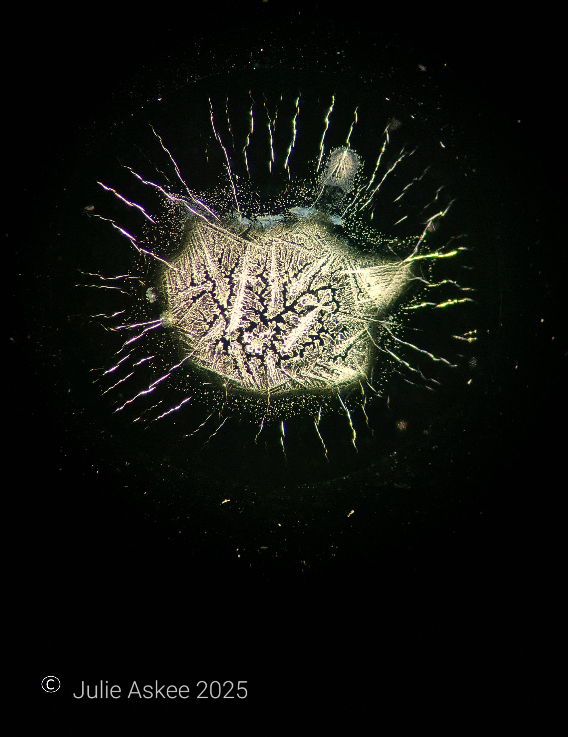 Julie said: “‘Coco’ is a photomicrograph of a drop of dog saliva residue. (ZEISS darkfield 20x). Research is on-going regarding the patterns of contaminates left in human dry drop residue of both saliva and blood, with diagnosis of disease possible with this non invasive method. I am interested in the possibility of this being used for veterinary research, with dogs as the first test group. The potential is endless.”
