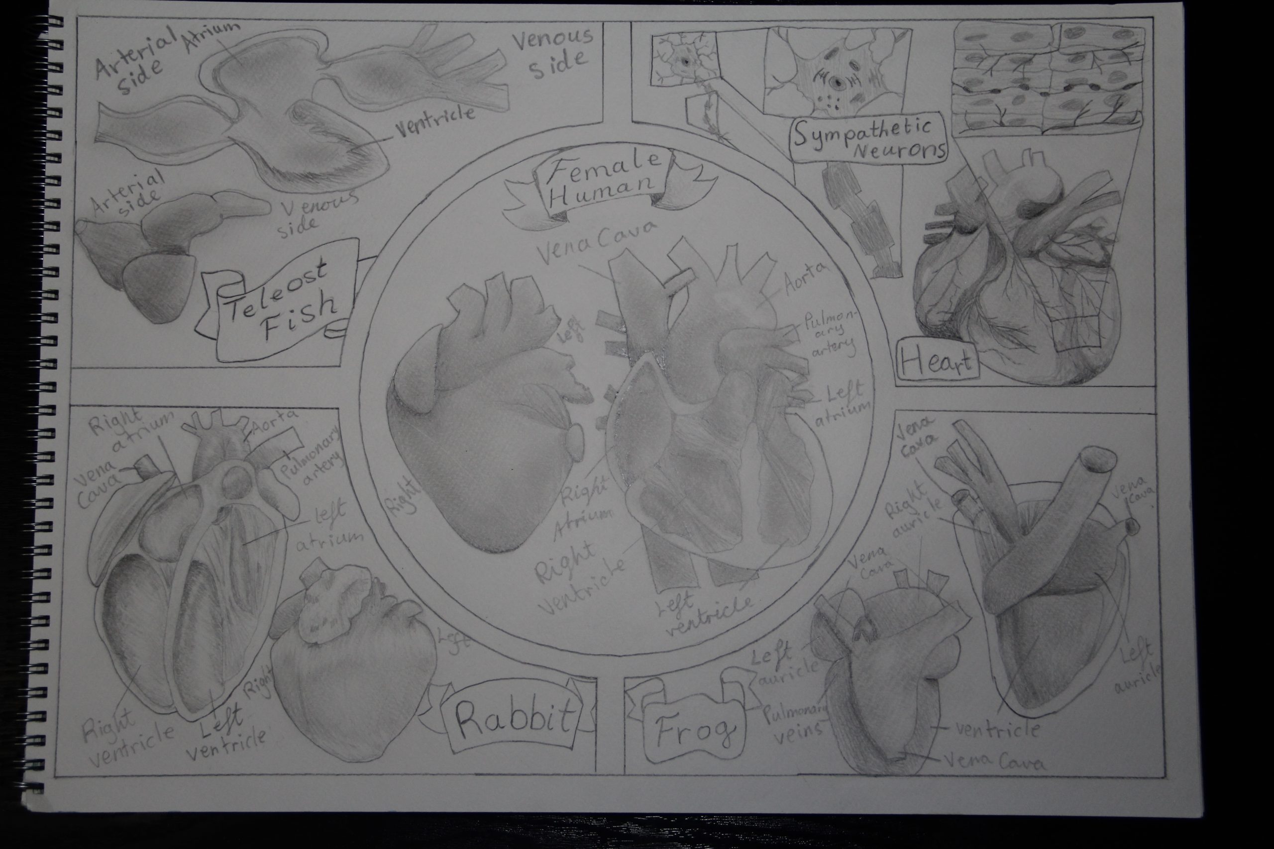 Alice said: “In the pencil sketch (using a collection of pencils e.g. H, 2B) I have created; I have illustrated both the similarities and distinctions between human hearts and those of various other animals. Labelled on my artwork are representations of the hearts of fish, rabbits, frogs and humans – each chosen deliberately to highlight the structural contrasts and connections. While the human heart closely resembles a rabbit, it